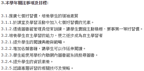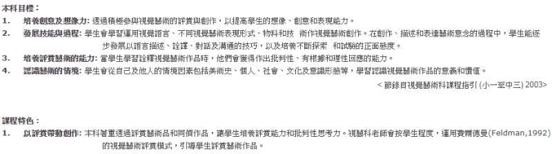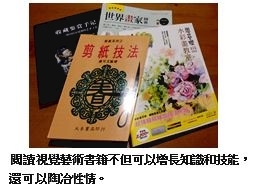 3. 從閱讀中學習: 閱讀對孩子有莫大的益處,故本校各年級學生均需閱讀一本有關視 覺藝術的「必讀書」。此外,各級視藝科老師亦會從學校圖書館裏