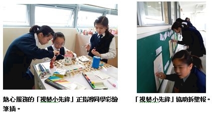 4. 培養領袖素質: 五、六年級的「視藝小先鋒」是本科的小領袖,她們會在開放視藝 室時段主動服務同學,協助構思視藝室壁報及帶領午膳小息視藝活
