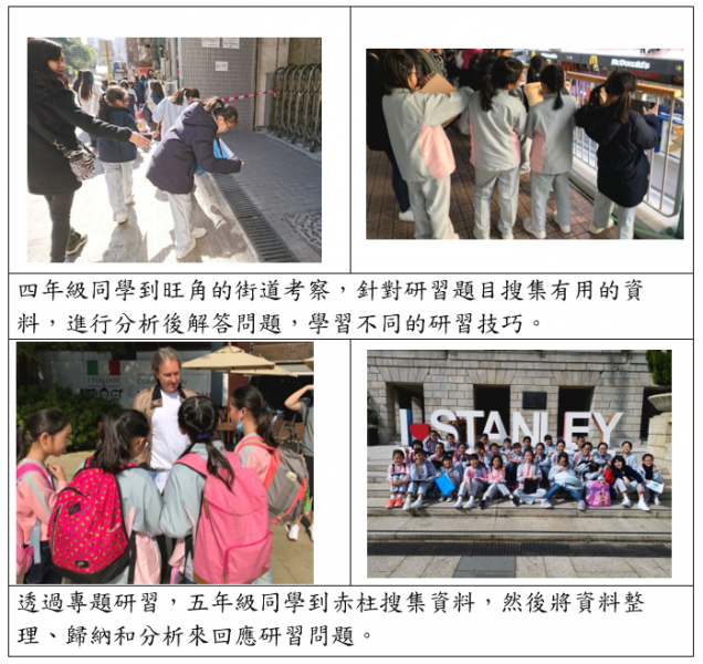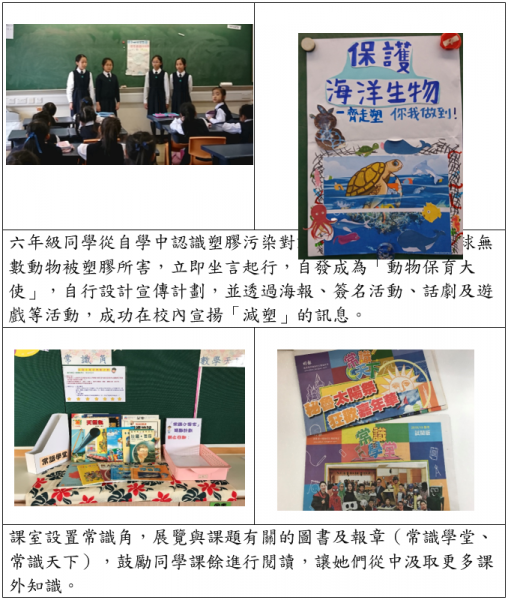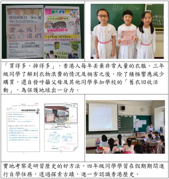 中文科為提升學生的閱讀及表達能力,於一至六年級全面滲入圖書教學,引導學生從教師導讀到自主閱讀,幫助學生掌握閱讀圖書的方法。在推行期間,圖文並茂的圖書大大提升了學生的閱讀興趣,令學生容易投入,學習態度也變得認真和積極。