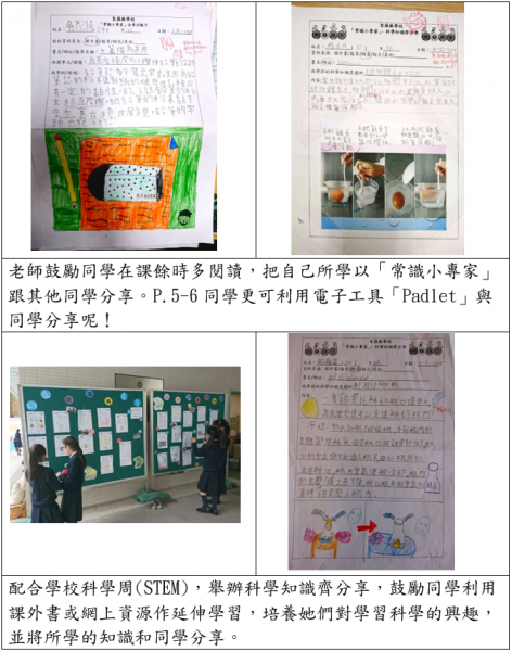 為了增强學生對寫作的興趣,三至六年級的中交科任老師都會把學生全學年的佳作編輯成班級小報,以鼓勵學生互相欣賞和交流。學生每次收到班報,都看得津津樂道。有些學生看到自己的作品被甄選為佳作,並刊登成在班報內,更有說不出的滿足感。