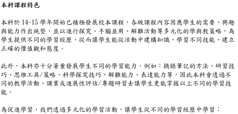 為了加強閱讀與寫作的聯繫,進一步提升學生的思維能力。中文科於14-19年度參加了教育局校本課程發展支援服務,重整校本單元,落實以讀帶寫,並滲入思維訓練,以培養學生的思維能力和素質,提升學生自主學習的能力。